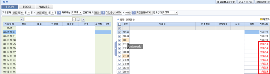 부랴부랴 일반전표 메뉴에 들어가서 아직 완성 못 시킨 전표들을 전체 선택 후 F5번 눌러 삭제를 했는데, 통장 내역에 다시 와서 해당 날짜 전표를 치려고 검색해 보니 삭제전표라고 빨간 글씨가 떠 있는 것이다.