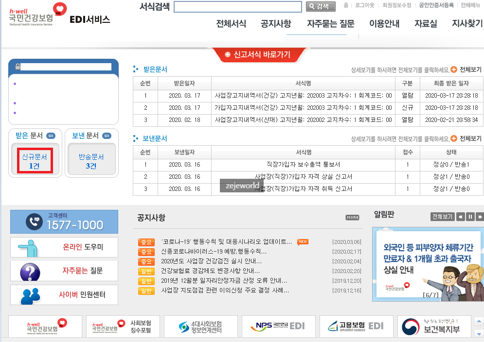 EDI 공인인증서 로그인 후 신규 문서 클릭하면 고지서 내역이 와 있다. 여기서 내가 필요한 건 가입자고지내역서 말고 사업장 고지내역서(건강)!!