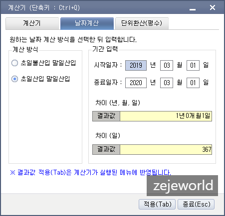 날짜계산 탭에서 보험료 일자를 계산한다. 예를들어 2019년 3월 1일~2020년 3월 1일이면초입산입 말일산입을 누르고 시작일자에 2019년 3월 1일일, 종료일자에 2020년 3월 1일을 차례대로 입력하면 결과값이 나온다. 이 때 하단의 일수 계산된 것(사진에서는 367일)을 기준으로 계산해주면 된다.