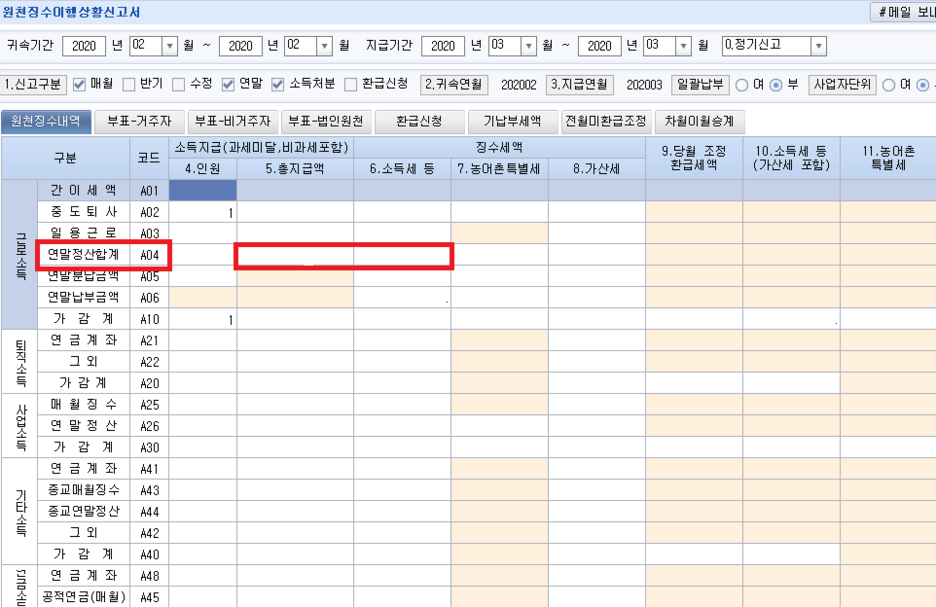 이 부분에 대해서는 4월 10일까지 원천세 신고를 할 때, 2월 귀속 3월 지급의 원천징수이행상황신고서를 작성해야 한다.