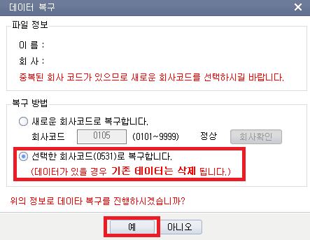 회계 > 기초데이터 > 보조데이터관리 > 백업데이터복구 > 데이터 경로(데이터백업을 해둔 저장 위치) > 복구하기