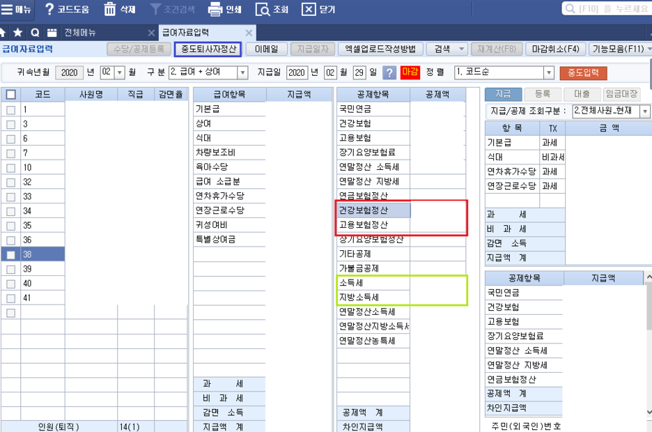 중도퇴사자의 경우 건강보험공단에 전화해서 퇴직정산금을 알아내고 급여대장을 작성해야 한다.