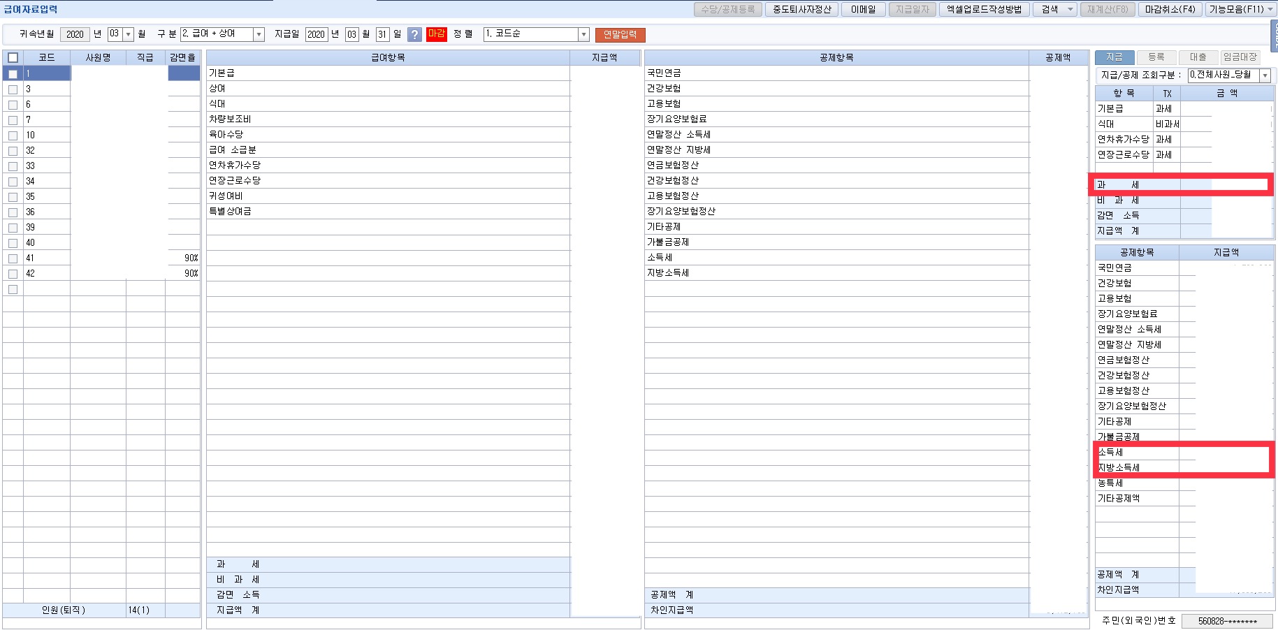 급여대장에서 다른건 필요없고 우측에 소득세와 지방소득세가 밑에서 조회할 원천징수이행상황신고서에 잘 불러와지는지 확인하면 된다.
