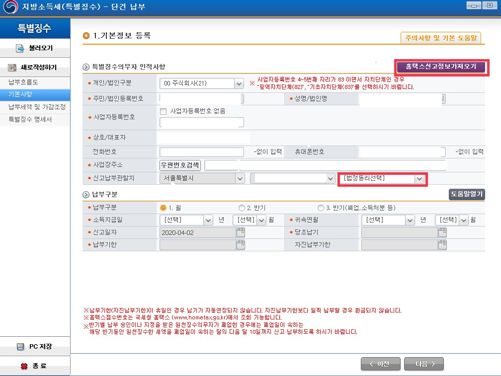 다른건 그냥 다 불러와지는데 법정동리선택만 해준 다음 홈택스신고정보가져오기 클릭하면 알아서 밑에도 다 불러와지므로 다음으로 넘어간다.