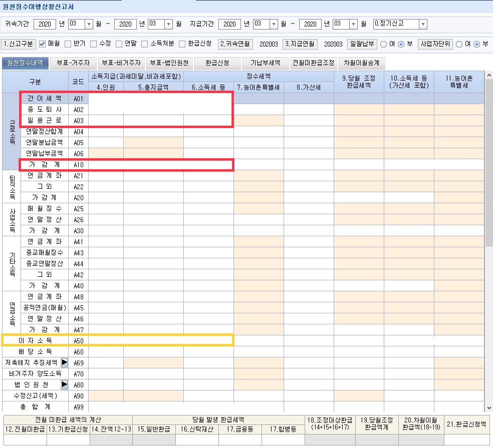 그리고 원천징수이행상황신고서에는 과세금액만 나오기 때문에 우측 상단의 과세 금액이 원천징수영수증의 A01번과 일치하는지도 보면 된다.