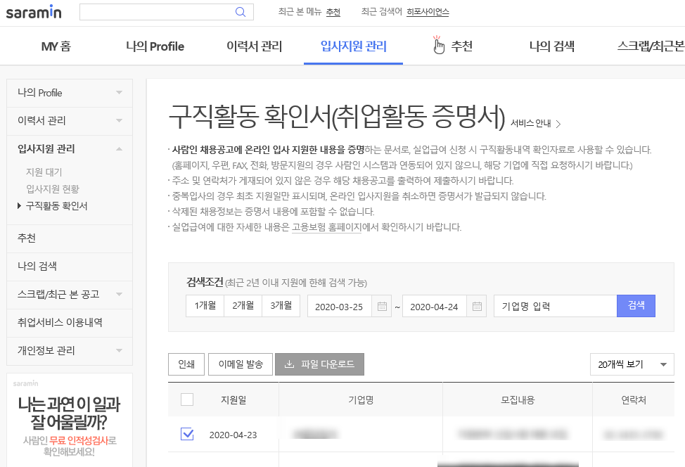 그리고 이제 취업활동을 했다는 것을 인증해야 하는데, 워크넷으로 구직활동을 했다면 자동으로 기록이 따라오는 것 같다. 근데 나는 사람인을 주로 이용하기 때문에 사람인 사이트에 가서 구직활동 확인서를 다운받았다.