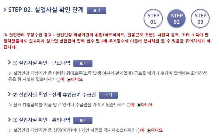 혹시 실업인정 대상기간중에 취직이 됐거나 혹은 일용직으로 하루/한 시간이라도 근무한 이력이 있으면 여기에서 꼭 신고를 해주어야 한다. 이를 어길 시에는 부정수급으로 간주하여 불이익을 받을 수 있으므로 주의해야한다. 네이버 애드포스트나 쿠팡 파트너스로 인한 수익 발생에 관해서는 직접 내 실업급여 담당자에게 확인해야하는 것 같다. 너무 소액이기도 하고.. 담당자마다 말이 달라서 그런듯.