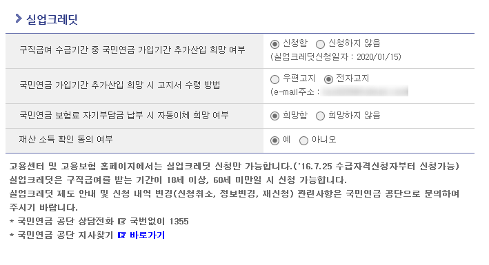 이건 맨 처음에 실업급여 신청하러 가면 물어보는 사항이다. 국민연금의 몇 프로를 국가에서 대신 내준다고 할거냐고 물어보는 거였는데, 나는 잘 모르겠어서 "다른 사람들은 보통 어떻게 하나요?" 하고 물어봤더니 담당자가 막 웃으면서 "보통 그렇게 물어들보세요" 라고 하셨었다. 나는 그냥 해달라고 해서 저렇게 자동으로 신청함에 체크가 되어있다.