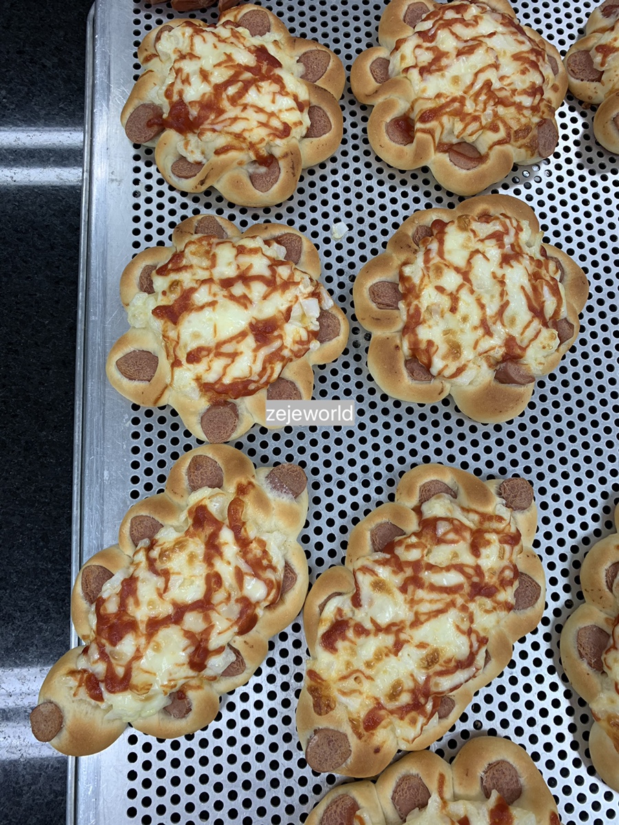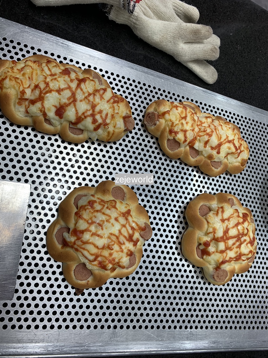 첫 번째 사진 꽃은 8개로 잘린 거고 위의 사진 꽃은 7개로 잘린 것. 확실히 6번 잘라 7개로 나오는게 예쁘다. 꽃 모양을 할 때는 가운데로 들어가는 소시지 반죽이 튀어나와있으면 안되므로 꼭 손으로 눌러 넣어주어야 한다. 안 그러면 구울 때 폭발함.